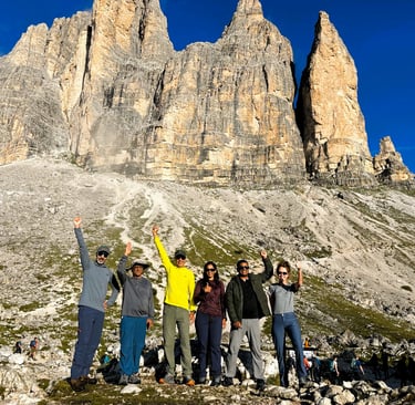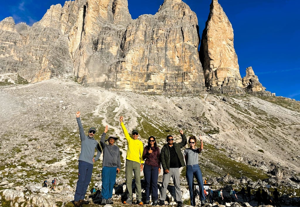 Accommodations: Clean bunk beds. Hot pre-paid showers daily, each lasting a full two minutes. One will come to know the value of time! Meals: I gained weight with all the delicious hot food served at breakfast and dinner. Palatable or delicious (subjective view) lunch was prepared by the guide at convenient rest stops, we just needed to help carry the food items every day. In addition, there were cafes with delicious pastries along the way. Trek: The trails were along gorgeous landscapes, strikingly stark at times with scree but just plain beautiful. There were up mountain passes and down deep valleys. The pace was moderate, I never felt rushed, except when overwhelmed by the first full view of Tre Cime. A sight to remember…